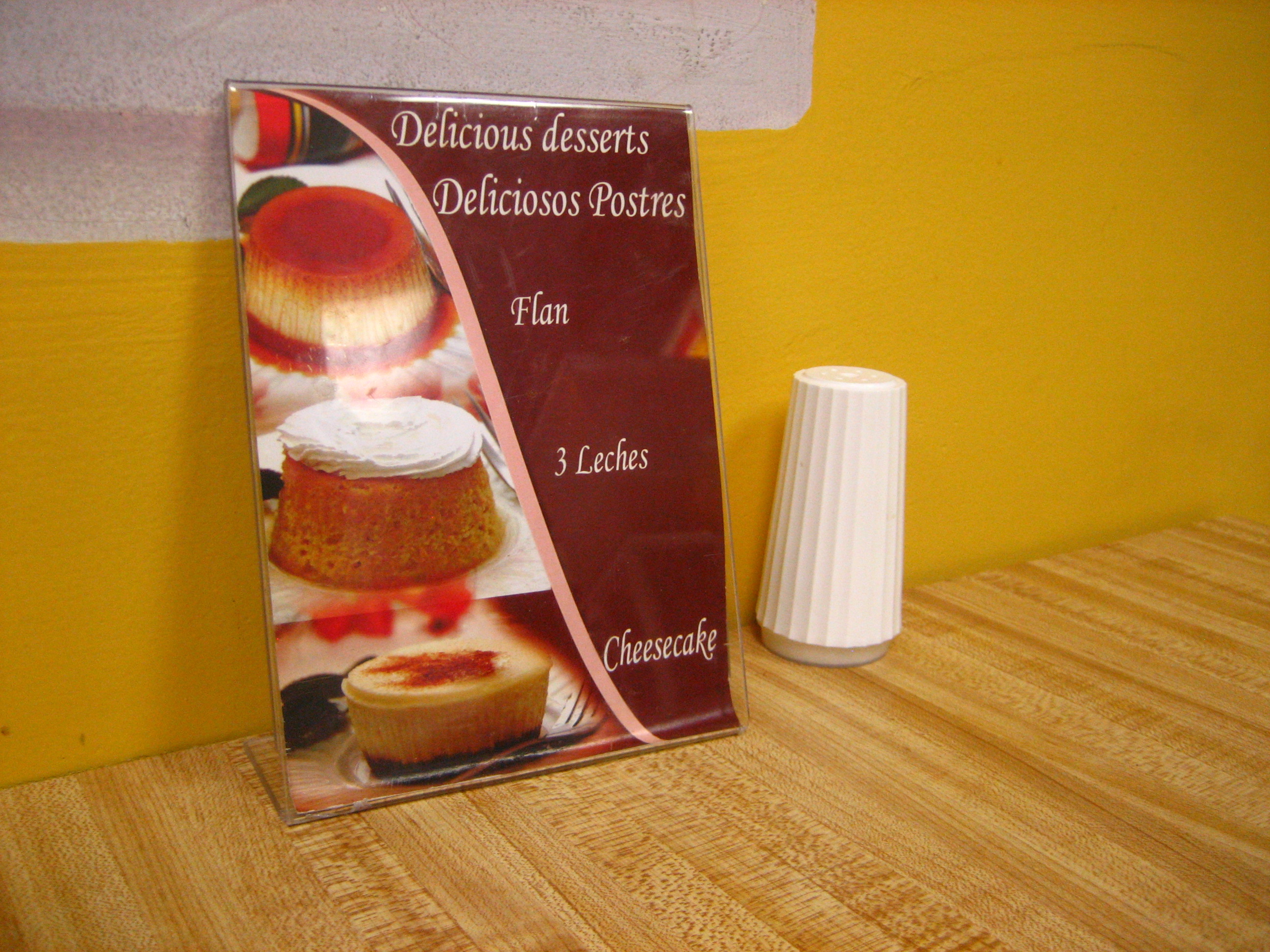 Salt shaker, dessert menu (flan, 3 leches, cheesecake).