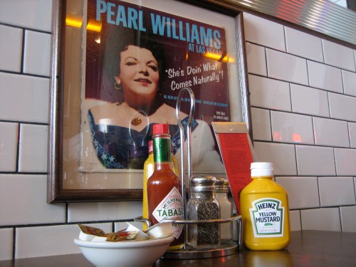 White bowl with 9 butter packets, salt and pepper, yellow mustard, spicy mustard, Tabasco, an Eleven City manifesto in silver frame, Pearl Williams “party” record. 1112 S. Wabash Ave., 312.212.1112