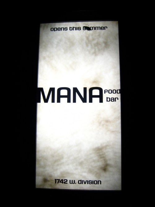Actually it was a very cool katydid perched on Mana Food Bar’s glowing outdoor sign last night. Props to Tonia for getting close enough to take shot number two.