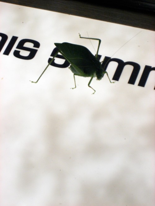 Actually it was a very cool katydid perched on Mana Food Bar’s glowing outdoor sign last night. Props to Tonia for getting close enough to take shot number two.
