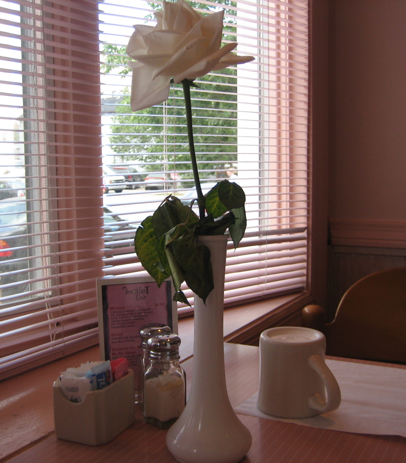 Single white rose (real) in vase, salt and pepper shaker, sugar and sugar-substitute packets in white ceramic holder, framed menu, white coffee mug, white placemat. 1381 W. Hubbard Street, 312.666.2372