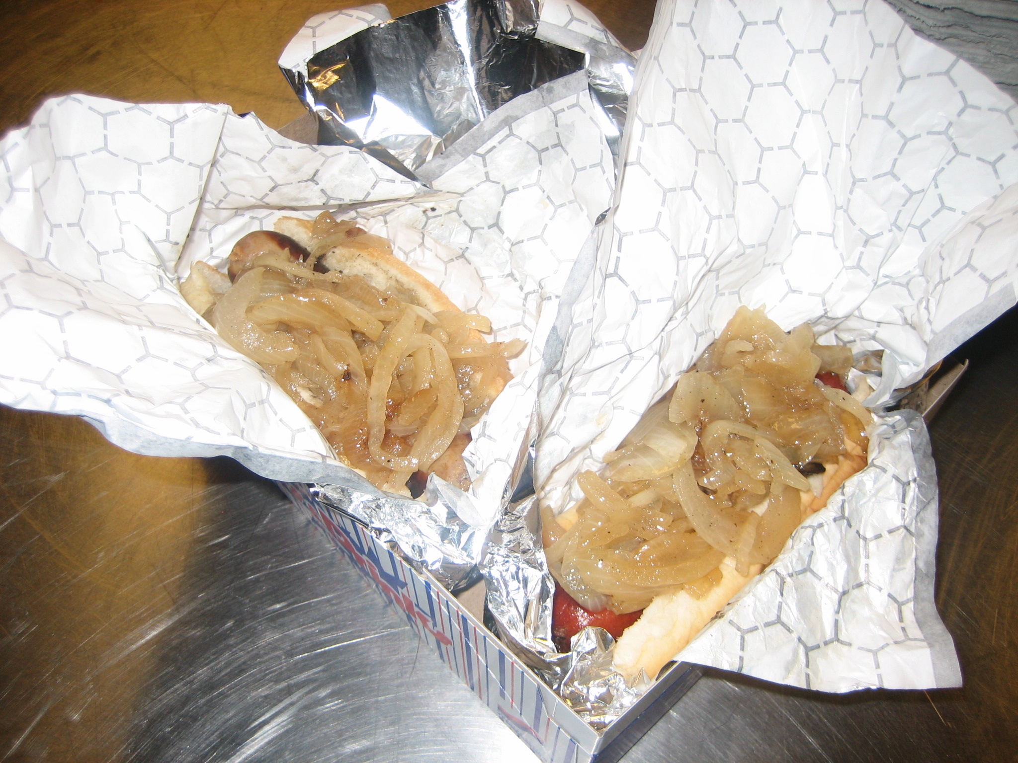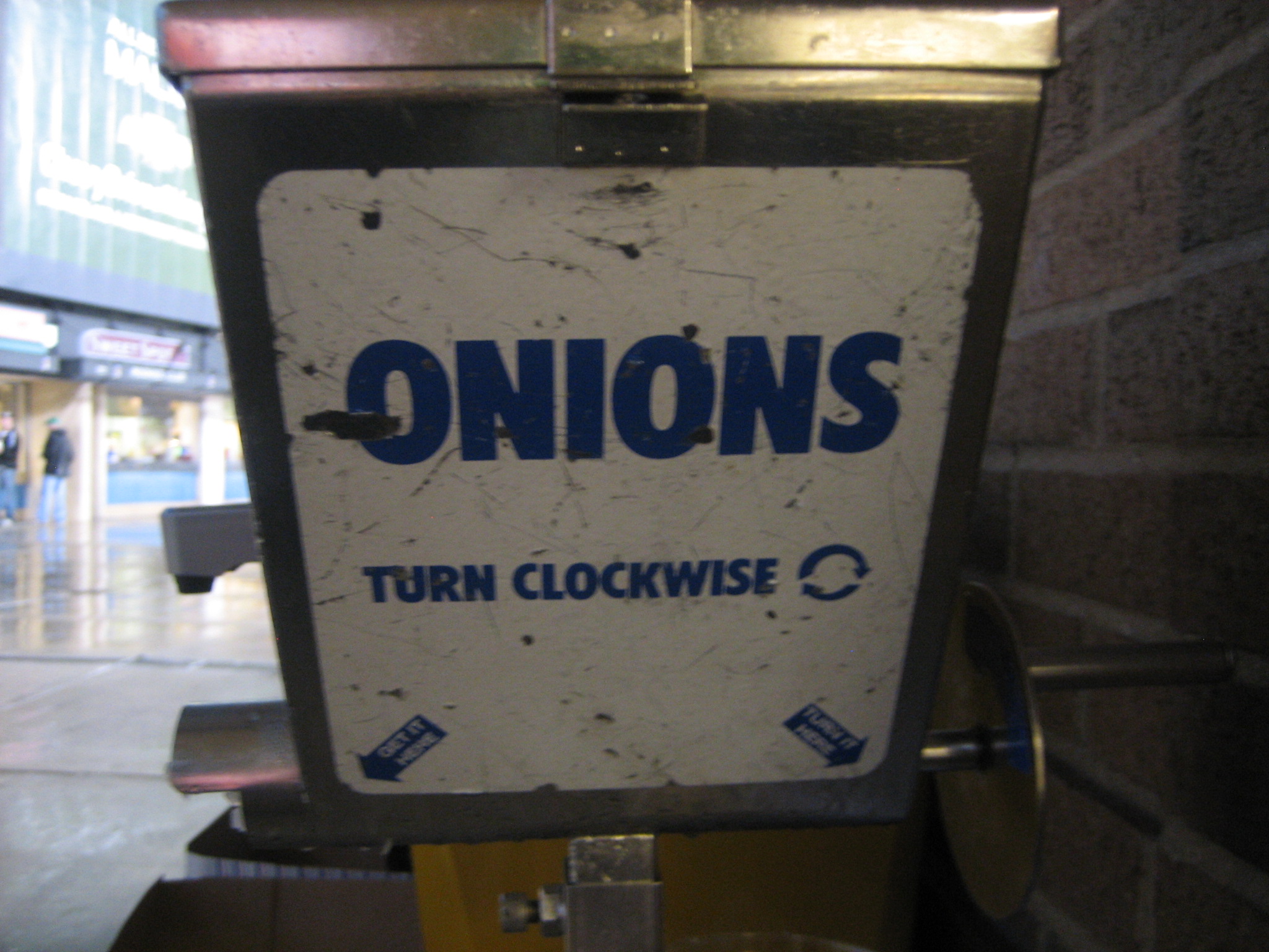 I meant to post this weeks ago, but keep getting sidetracked by mystery posts and guest bloggers. I hadn’t been to a White Sox game in 10 years when I was invited to make the trek down to U.S. Cellular Field mid-September for a game that ultimately ended up being rained out. But, I did get a kelly green “Halfway to St. Patrick’s Day” Sox hat, and chance to try a killer brat from the Straight-Away Café on the first level of the Field (the best in the park, I was informed by my Sox fanatic friend, John MC). The rain poured down long after the game was called off, but we stuck around in it to sneak down to the Straight Away and experience the divine, buttery Hillshire Farms brat resting inside a steamed bun (I get it now!) and covered with a mound of juicy grilled onions. Speaking of onions, I also spotted an onsite onion dispenser, which didn’t photograph as well as I would’ve liked, but was cool nonetheless. With the Sox making the play-offs, I felt this post became timely again, but Northside readers take note: I really don’t favor either Chicago baseball team. In fact, I’m not into baseball at all, but I’m definitely into brats. Anyone know of the best brat at Wrigley? I was only there once this summer, and it was pre-Elizabites.