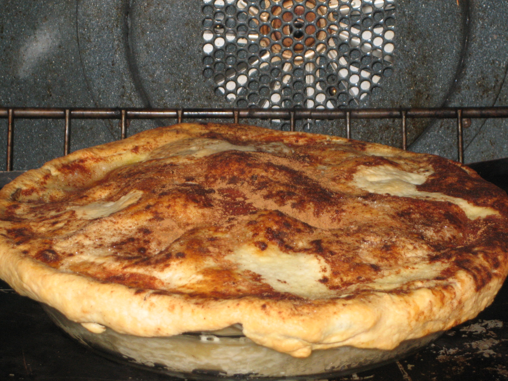 Unroll defrosted pie crust and lay on bottom of pie pan. Add first layer of sugar (3 TBS), butter (3 tsp), cinnamon (2 TBS), a squeeze of half a lemon.