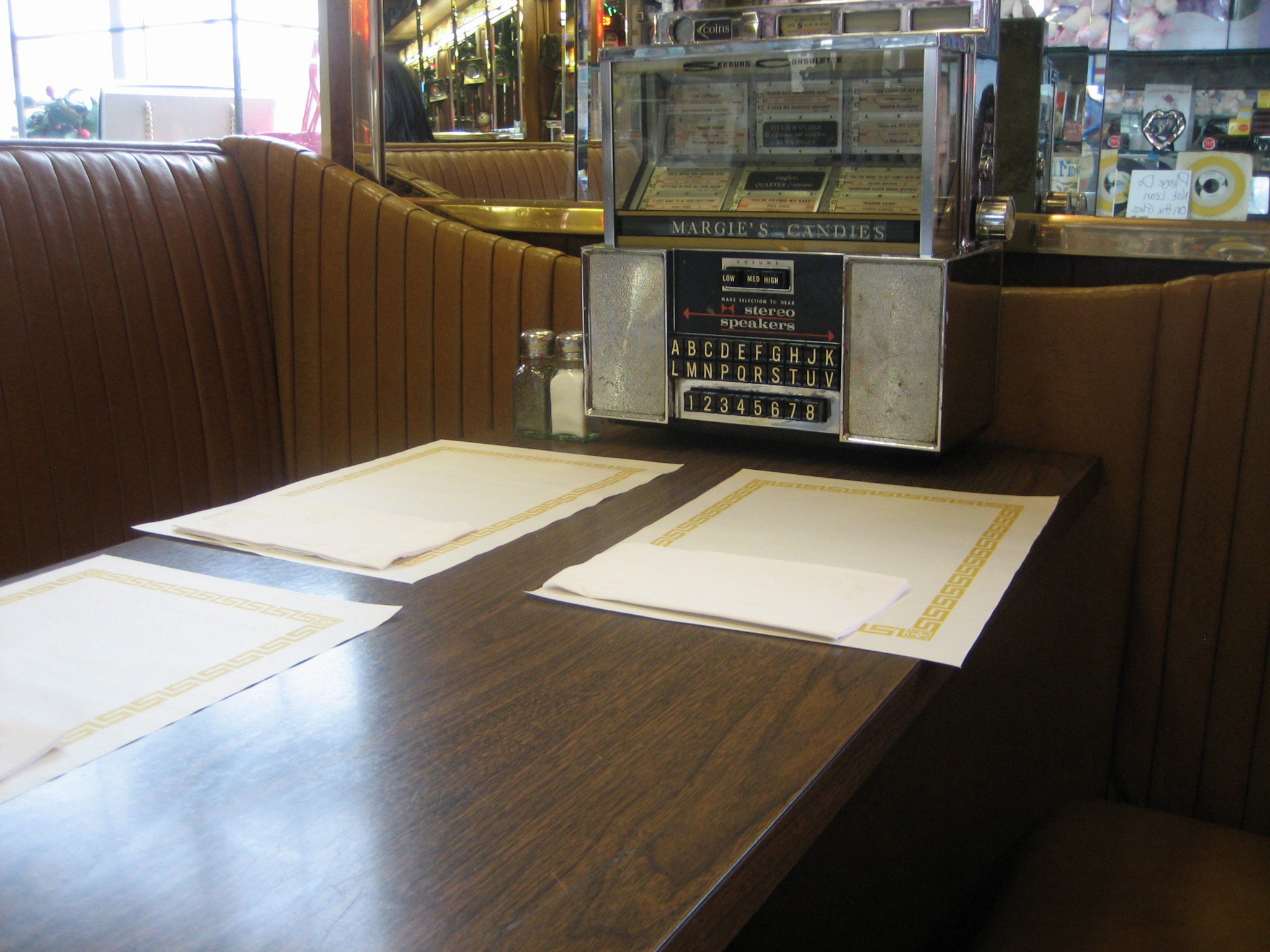 Three placemats, three napkins, salt and pepper shaker, mini juke box, (“Al Capone’s table” complete with mirror instead of windows). 1960 N. Western Ave., 773.382.1035