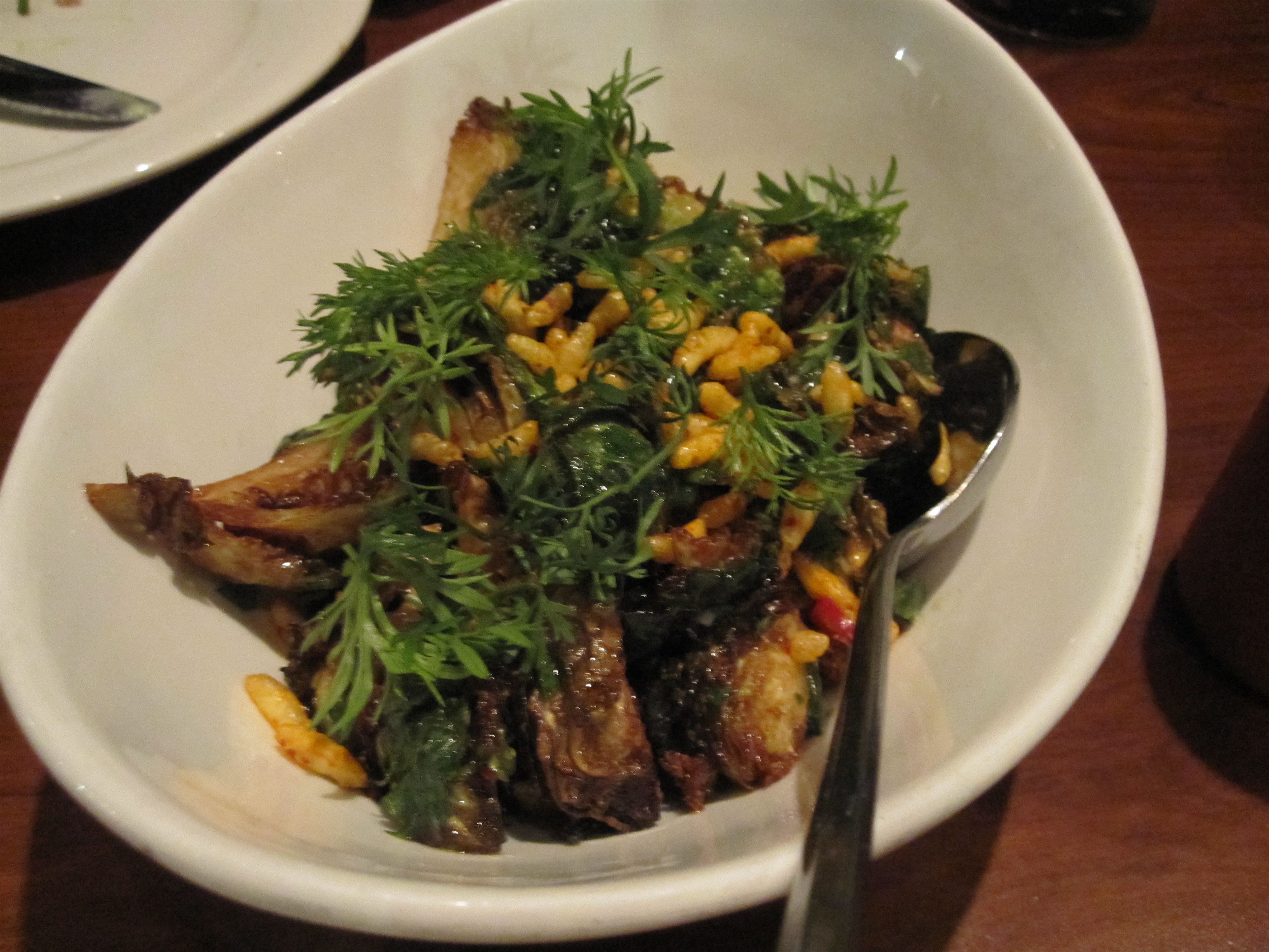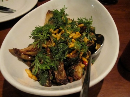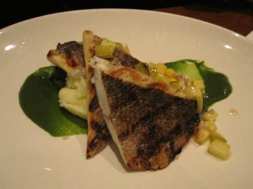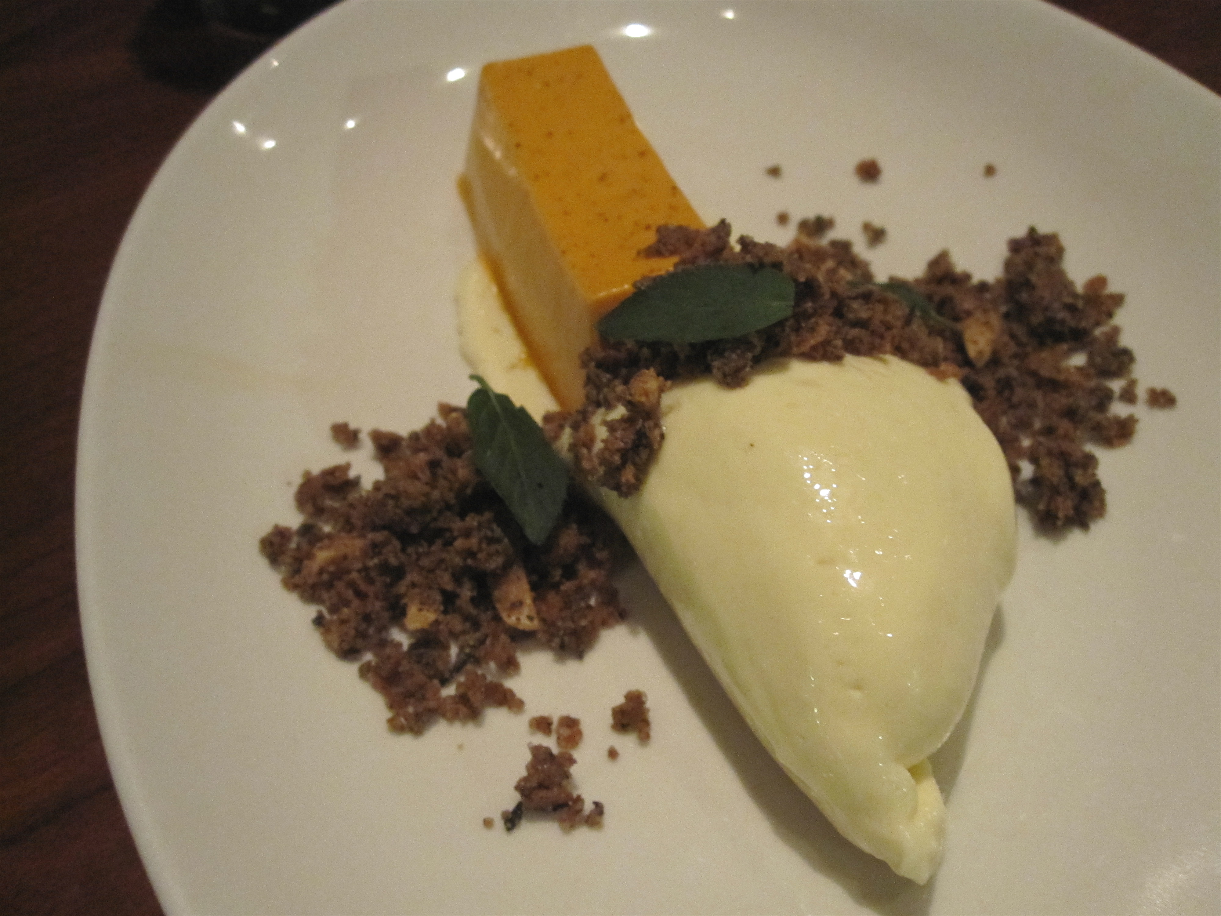 For dessert (yes, we had dessert even after our appetizer of Milk Bar cookies), the Thai Iced Parfait was too intriguing to pass up. Of course, it was totally unexpected; a quenelle of perfectly tart lemon mascarpone nestled up to Thai iced tea custard in a long, rectangular shape. A pile of crunchy granules of almond tea held them together on the plate. Pretty. Delicious. Gone in 60 seconds.