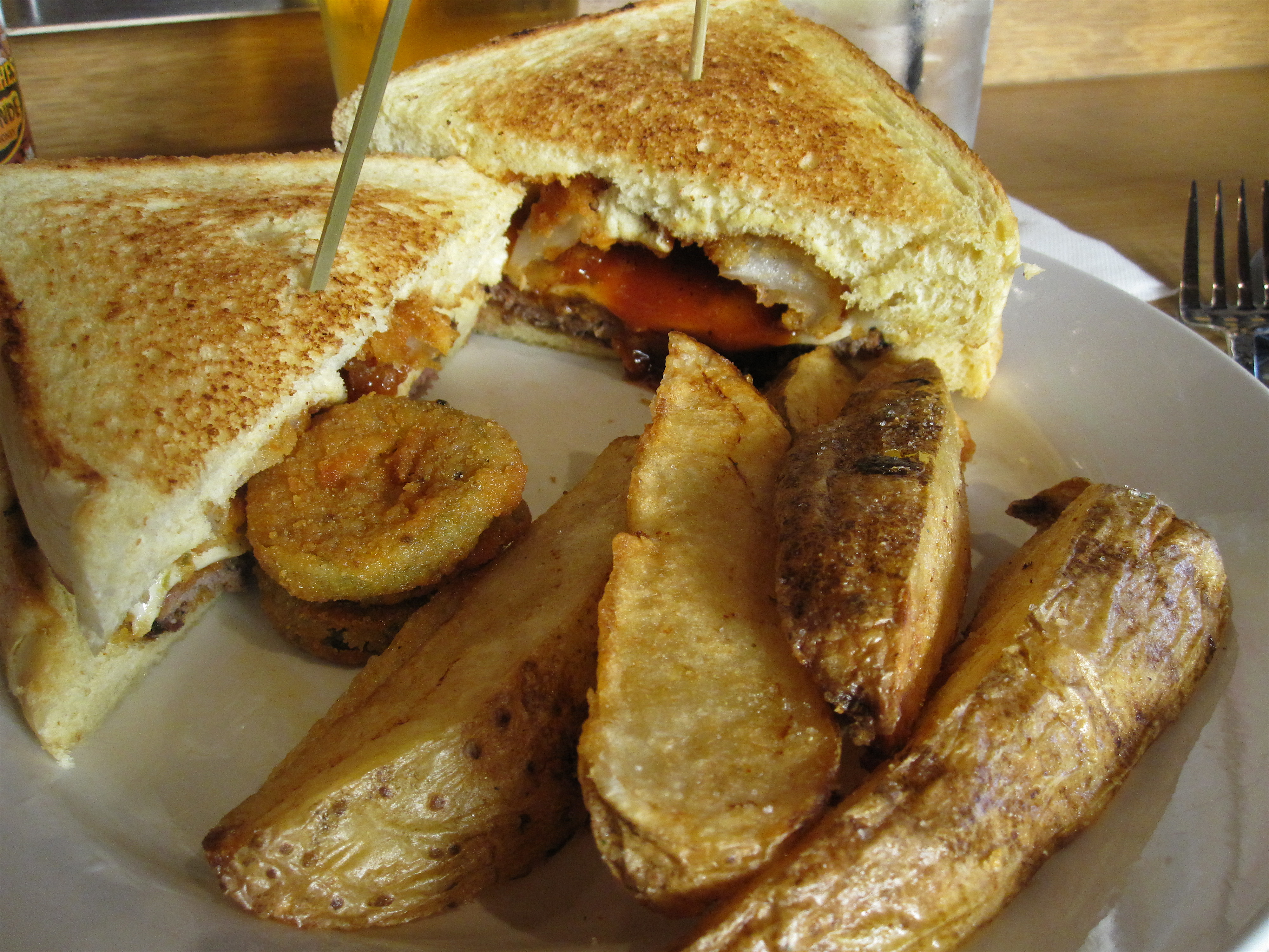 Burger bars with locally sourced ingredients (along with taquerias, noodle bars and breakfast/brunch spots) seem to be all that’s opening these days. Not that I’m complaining. Along with the new DMK Burger Bar (watch for a post this week), I also recently checked out Stack’d, a new burger bar in Milwaukee. Kopp’s pretty much reigns when it comes to Milwaukee’s best burger, but this place is a promising contender. What I noticed first about the menu, (and something more restaurants should adopt), was a build-your-own burger option, with some pretty tasty rolls like Miller Bakery pretzel rolls, gluten-free Texas toast and regular bun for the bread offerings, patties like lean-bison, Wisconsin grass-fed beef and handmade black bean veggie, and fixins’ like jalapeño peppers, Nueske’s bacon and fried onions. But even if you don’t opt to stack your own, the specialty burgers on tap are all ridiculous-the hangover stack is beef burger with fried onions, bacon, Cheddar, lettuce, tomato, fried egg and Tabasco, while the German stack is a jalapeño blue cheese beer brat patty with raw onions, sauerkraut and stone-ground mustard. They also offer a salmon patty with fresh dill, a pulled pork stack and a veal, lamb and bison patty burger. I had been hearing a lot about bison meat, and felt compelled to go for the Don’t Mess with Texas; lean bison burger with pepperjack, jalapeños, fried onions and bbq sauce. The meat was juicy and flavorful, slightly gamier and heartier than regular beef, but not too bold to be on a burger. I loved that a traditional bun was replaced by buttered Texas toast which I could just eat on its own, and the crisp onion rings added more texture to each bite. The homemade barbecue sauce also added some tang, but only after an extra dousing. Fried pickles and skin-on potato wedges on the side more than rounded out our meal.