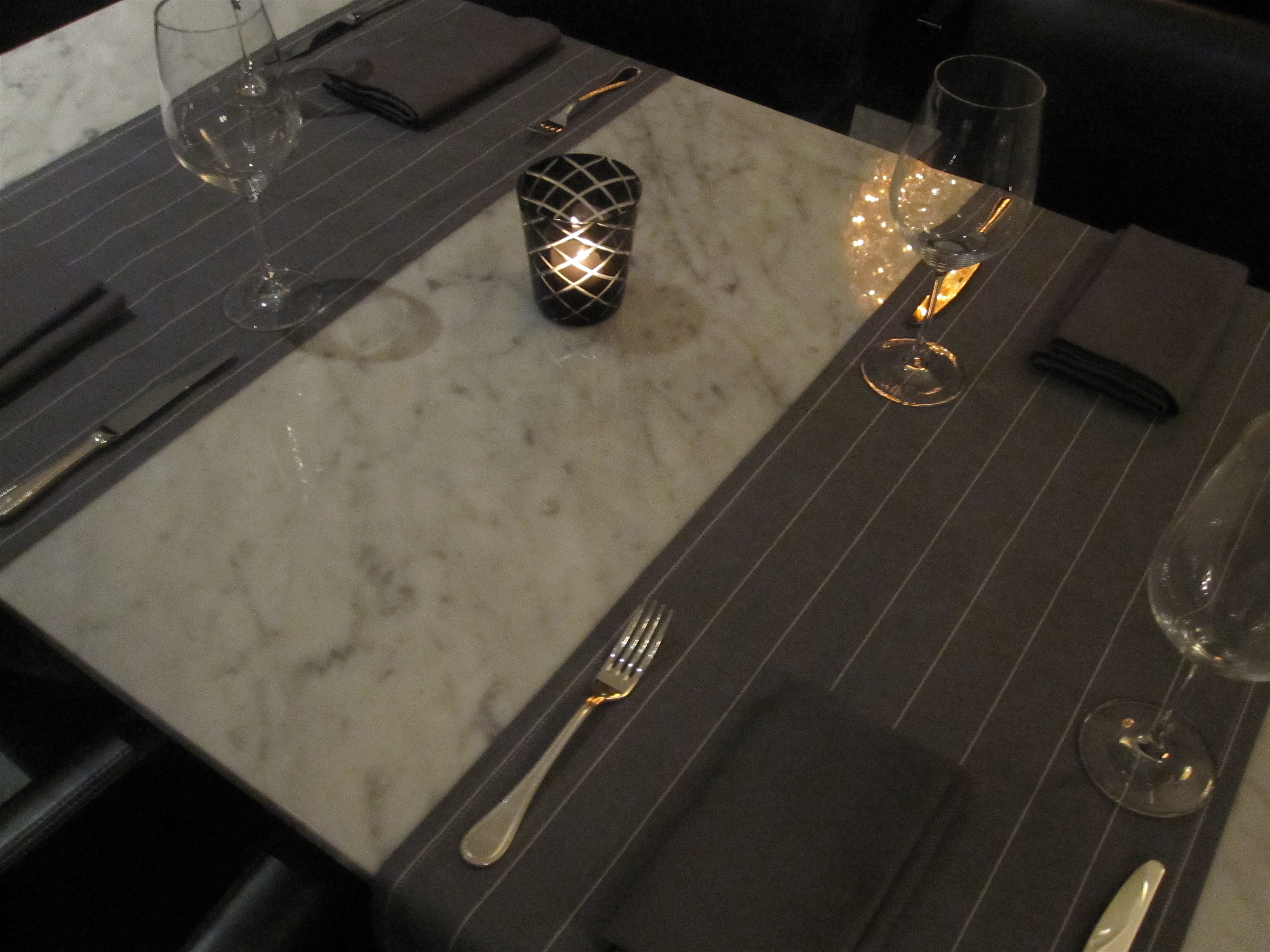 4 wine glasses, 4 forks, 4 knives, 4 napkins, 2 pin-striped table runners, votive, reflection from chandelier above. The Elysian Hotel, 3rd Fl., 11 E. Walton, 312.646.1300