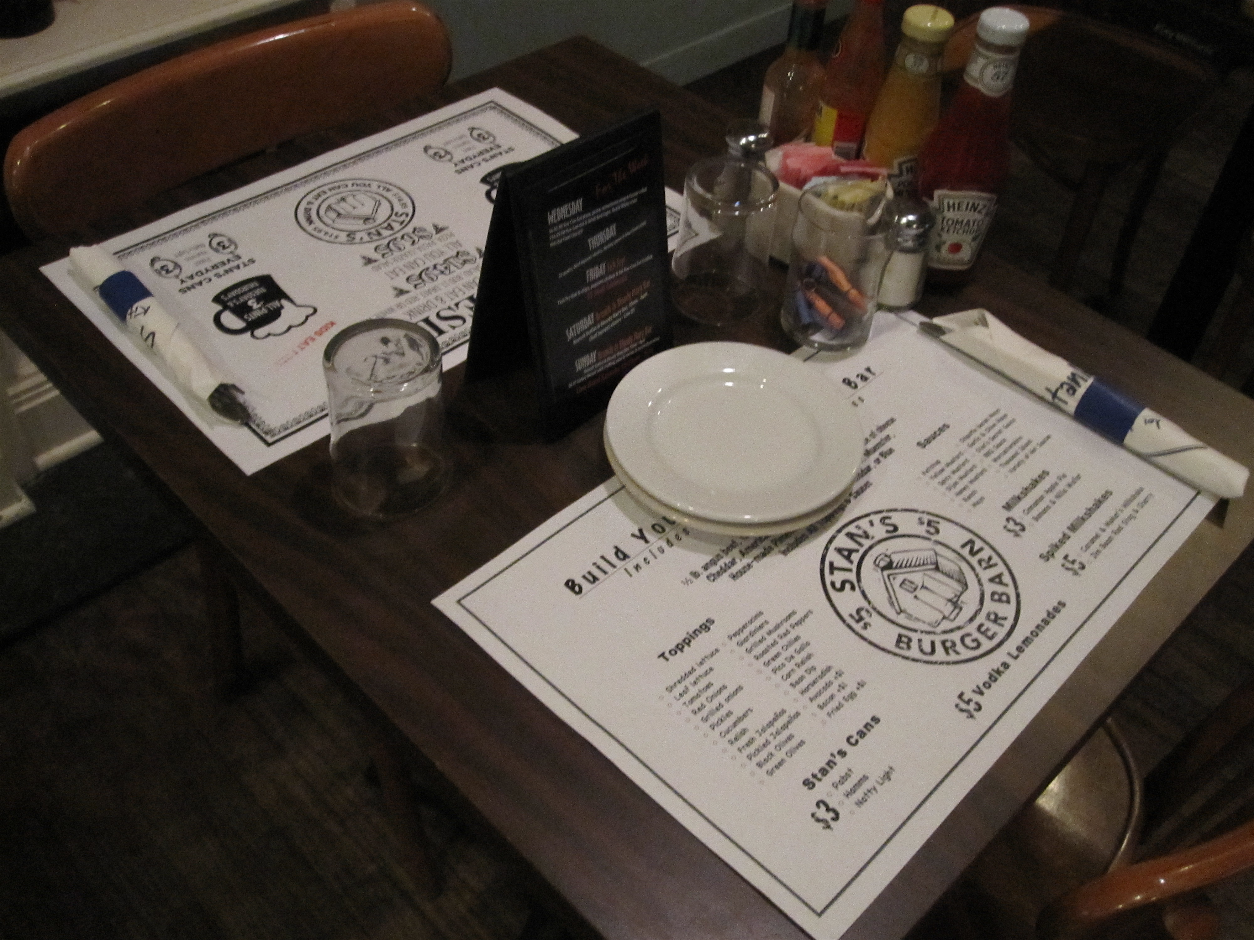 2 napkin rolls, 2 placemats, 2 plates, 2 water glasses, glass of crayons, ketchup, mustard, 2 hot sauces, sugar packets, salt, pepper, drink/food specials board. 1970 N. Lincoln, 312.642.0007