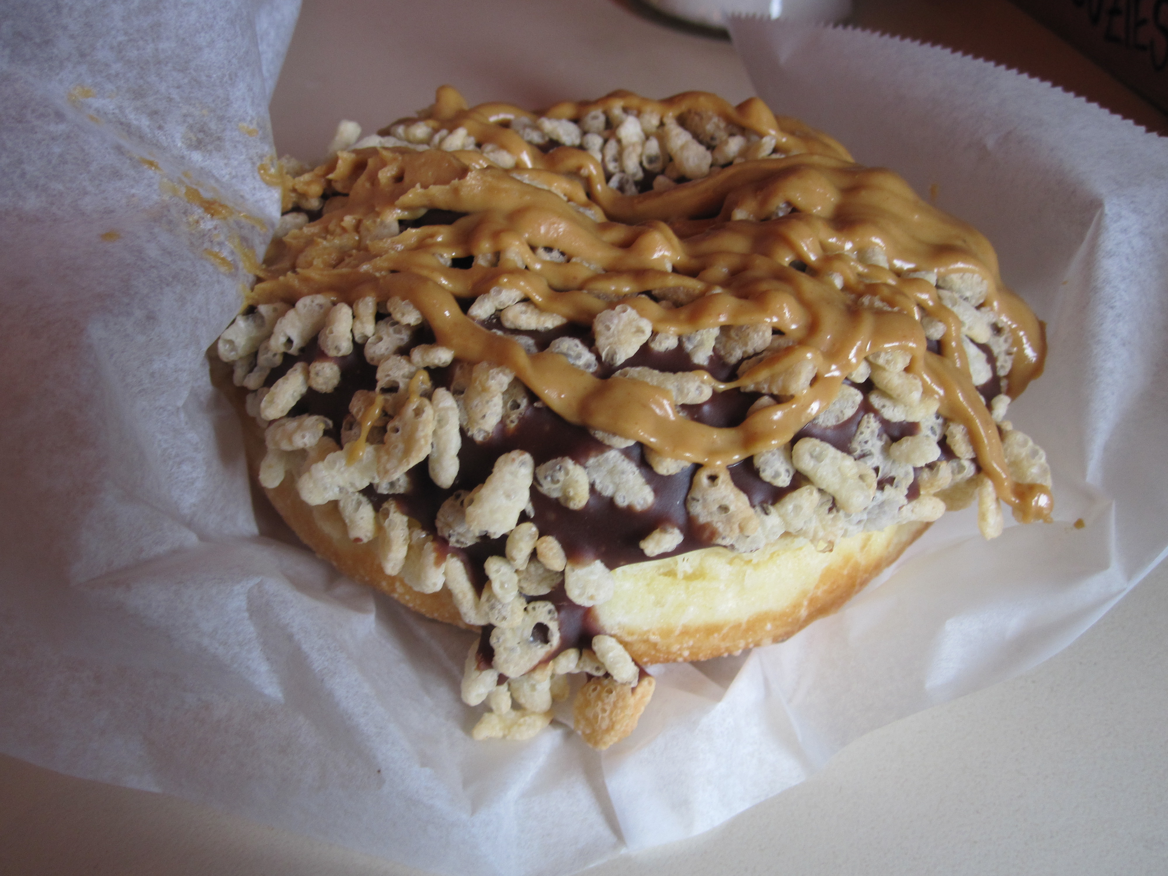 The choice was difficult, but anything with peanut butter and the added attraction of Rice Krispies was good enough for me. I eyed the Triple Chocolate Penetration (chocolate doughnut, chocolate glaze and Cocoa Puffs) and considered the Memphis Mafia (chocolate chips, banana and peanut butter glaze), but the Rice Krispes (called—or not called?—the No Name), was doughy, crunchy and fantastic, and took me about 30 seconds to scarf down.