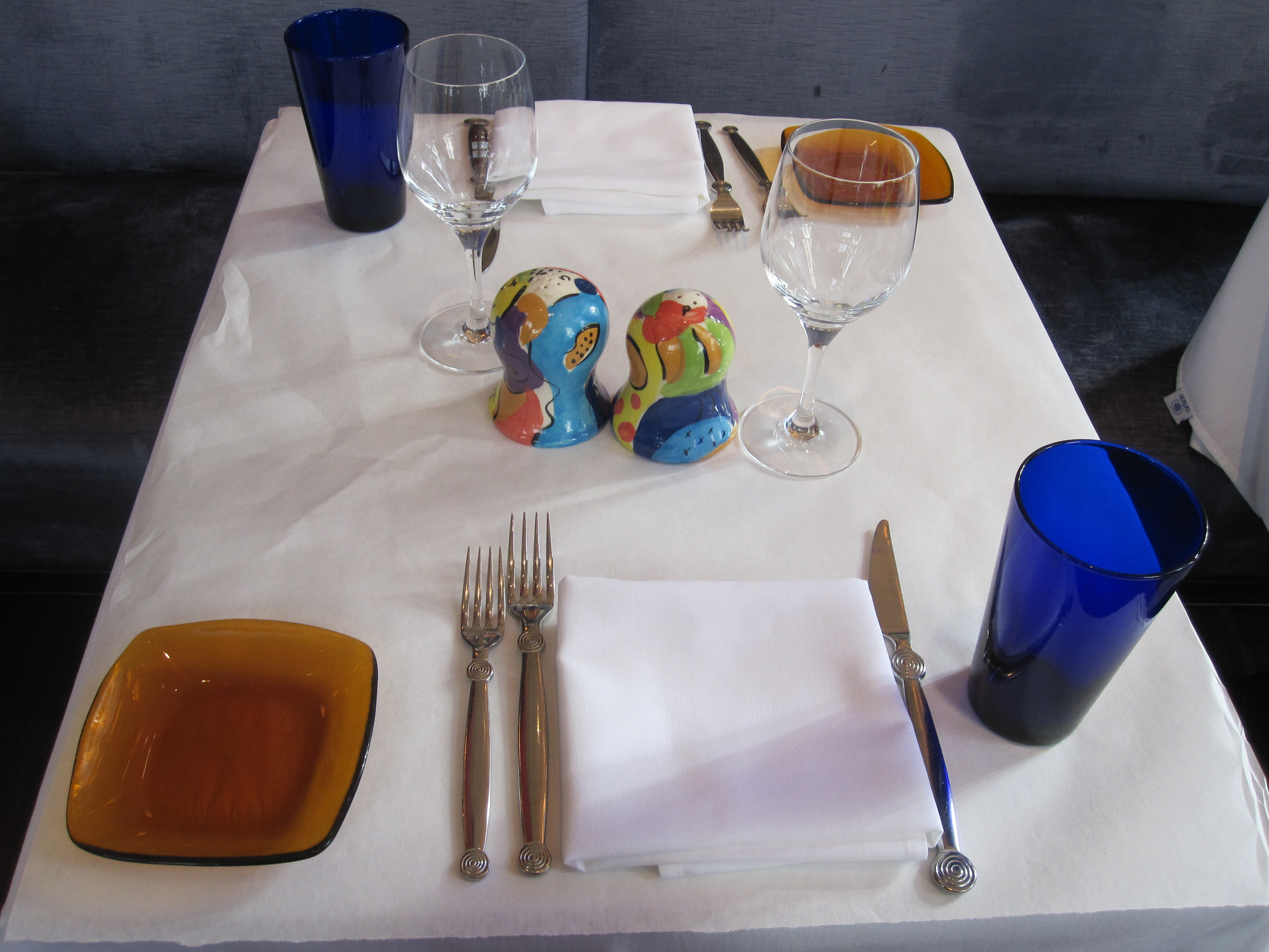2 wine glasses, 2 water glasses, 2 plates, 4 forks, 2 knives, 2 napkins, salt and pepper shakers, paper, tablecloth. Atwood Cafe, 1 W. Washington, 312.368.1900