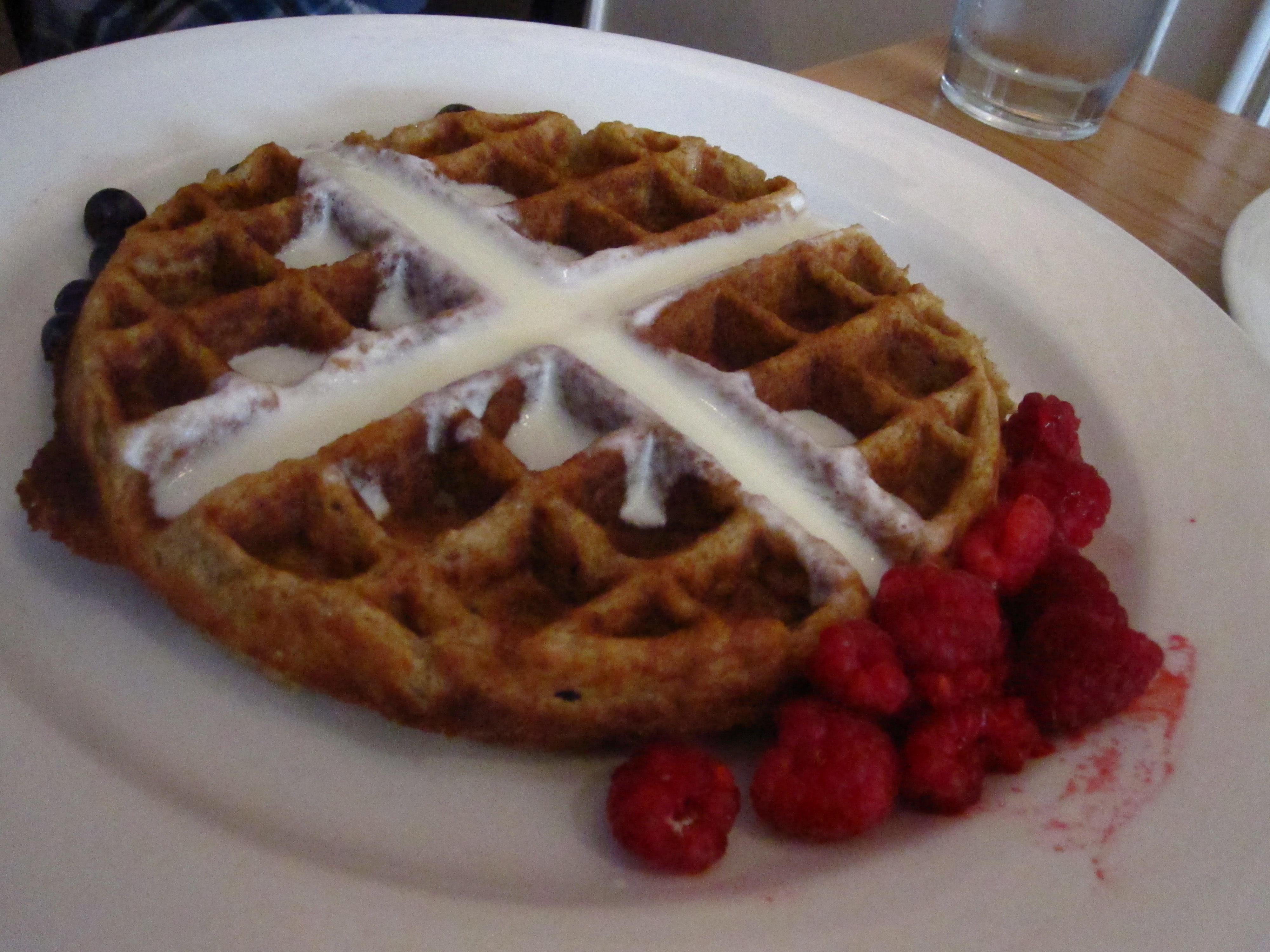 4). Hearty waffles, like the corn oat with Greek yogurt and fresh raspberries. Other interesting options? Banana-hemp cakes and other whole wheat cake concoctions that change out.