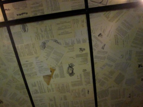 So before I reveal a key clue about this mystery spot, I need to ask Elizabiters if anyone out there actually made the heart and belly-warming treat that is pumpkin chocolate chip cookies…send in your tales! And in the meantime, take a guess at this mystery restaurant ceiling…covered with old cookbook pages…