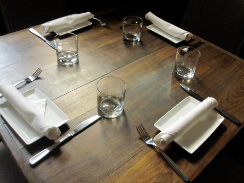 4 plates, 4 napkins, 4 glasses, 4 forks, 4 knives, Leopold, 1450 W. Chicago Ave.