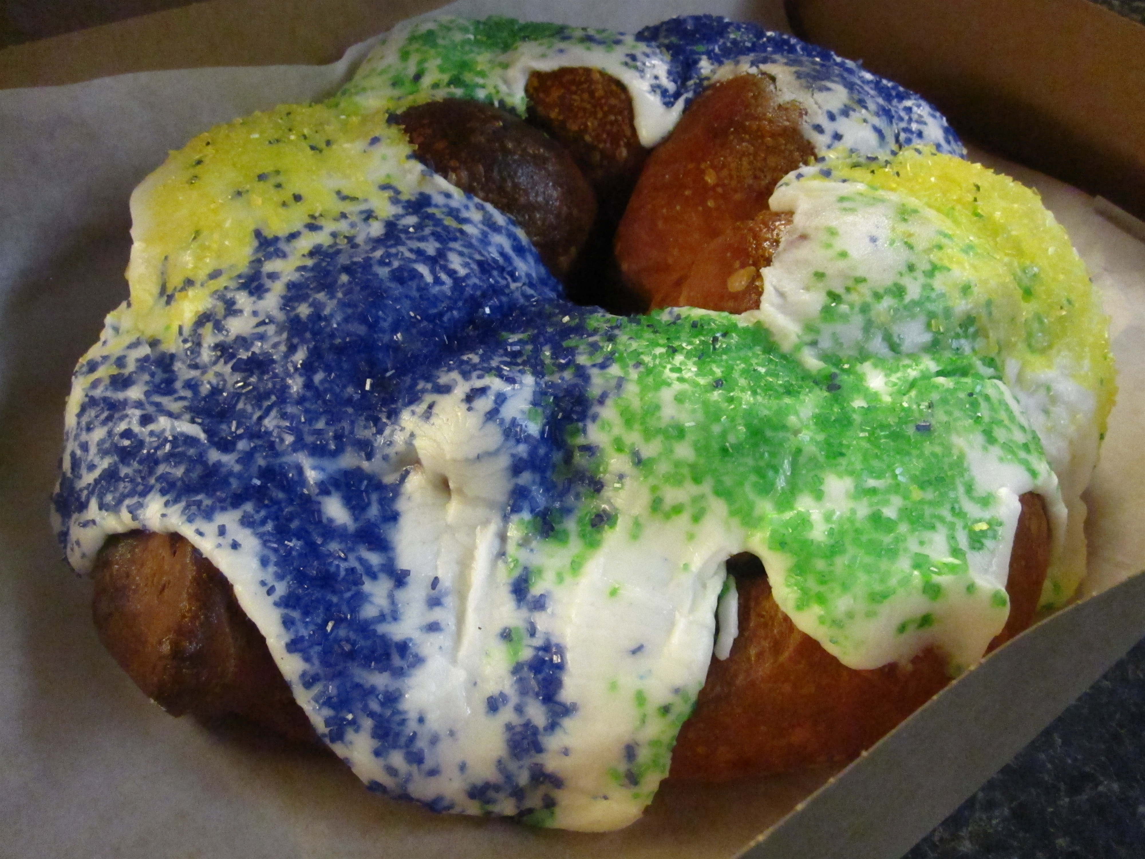 No this isn’t an outtake from cakewrecks.com (please check out this site if you haven’t already), but the totally delish King Cake from Alliance Bakery my very generous co-worker brought to the office yesterday. Although there are many versions, this one was kind of a flaky almost raisin sweet roll topped with vanilla frosting in all the right Mardi Gras colors. The plastic baby hidden inside almost fell victim to the knife as I was cutting, but was spared just in time. Either way, I’m glad I snapped this photo when I did, as this festive round loaf of goodness didn’t stick around long. Alliance Bakery & Cafe, 1736 W. Division Street.