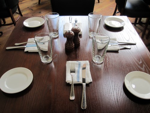 4 plates, 4 water glasses, 4 forks, 4 knives, 4 cloth napkins, salt, pepper. Chicago Q, 1160 N. Dearborn, 312.642.1160
