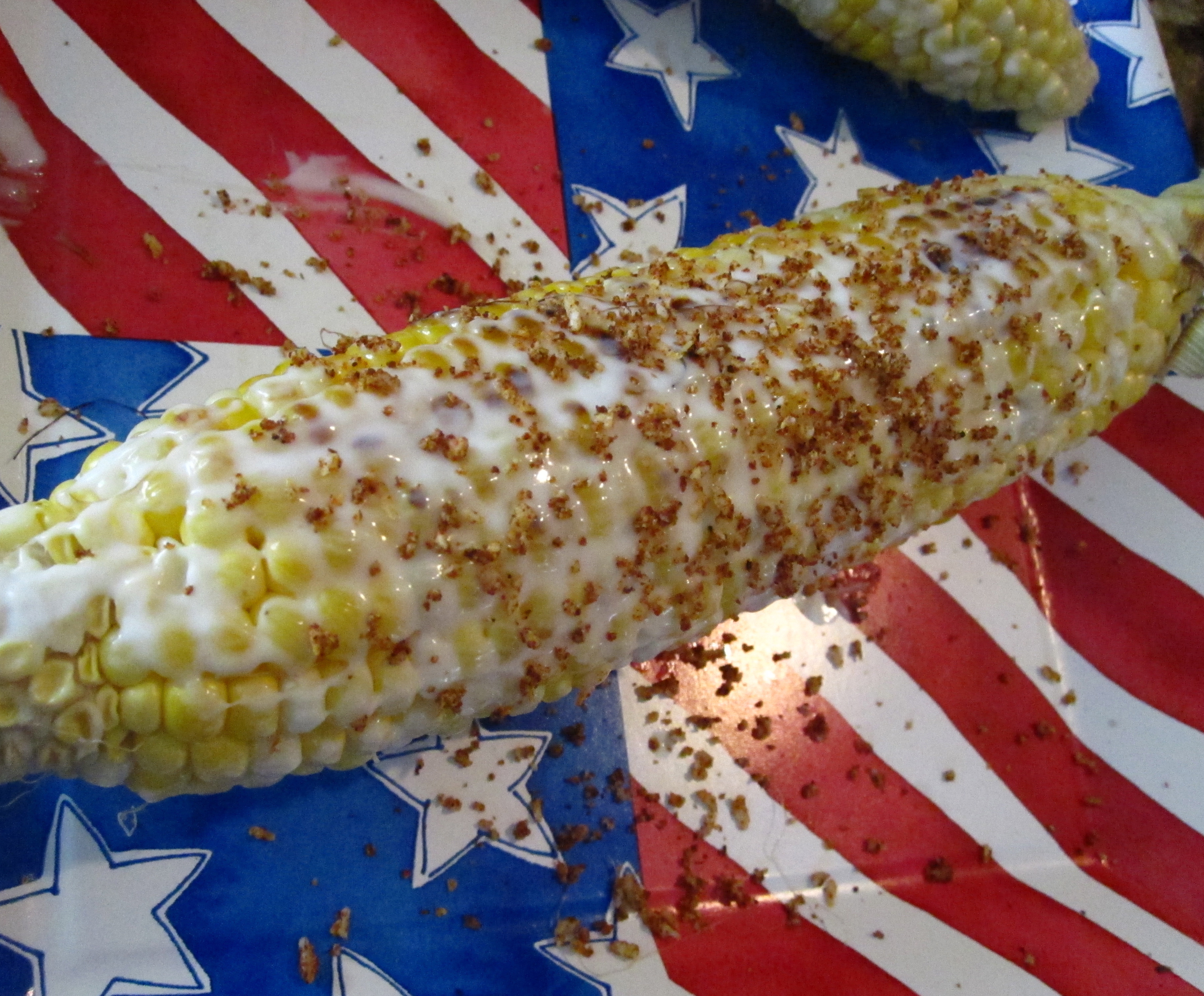 Well, not my home because I sadly lack a real grill, but my parents have a decent one and it was packed with their own Sconnie-influenced selections of boring burgers, dogs and brats this past weekend. My sister and I had to infiltrate with a few dishes of our own, and elotes (Mexican corn on the cob), was just one of them. I love this creamy, spicy snack and have gushed about them before. I hoped for fresher corn, but grilled up what I had and slathered it with a mix of mayo and fresh lime juice and the sprinkled it with Mexican cotija cheese, chile powder, ground red pepper, cumin and salt. Throw in my mother’s cheesy Independence Day paper plate action and we had ourselves a fourth of July.