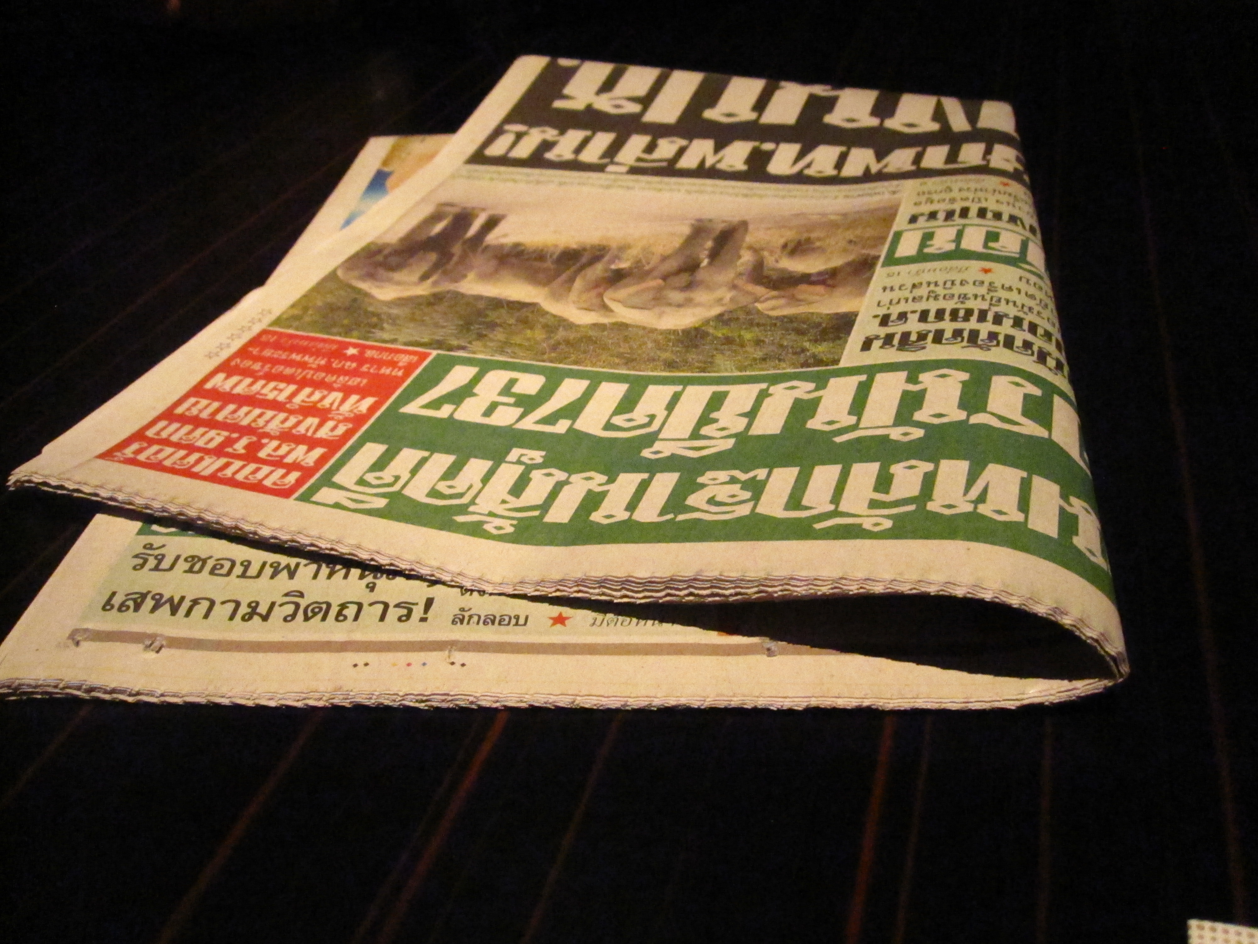 Just as with the stunning Paris 1906 menu at Next restaurant, I didn’t know what to expect from the next three-month incarnation—a taste of Thailand. Would they stick to the Thailand of the future (2036) plan I had originally heard about, and would that just be a Thai-style Alinea? Would the rather minimalist room (save the industrial tracks that snake along the ceiling) be decked with hot pink and gold silk fabrics? Would the spices have me soaking my entire face with water? Who knew? With a very lucky ticket in hand I went in to see for myself. I quickly found out the answer to each of my anticipatory questions was no. The decor is the same, the spices were vibrant, palate buzzing and complex but not too spicy, and the menu, it was more street and modern Thai than anything remotely futuristic. A good move, I thought, to focus on the flavors, ingredients and spices of Thailand, rather than try to pipe a tom kha gai foam over dehydrated pad Thai powder. The journey was real, and began with an explosion of color, flavor, oh, and Thai newspaper table coverings…