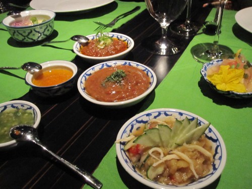 Ah, how good is Thai sticky rice on its own? Now picture about 10 various dipping sauces to ladle over it. We didn’t know where to go first, with sauce choices like salted duck egg, green mango, white radish banana pepper, cucumber, chili and dried anchovy tamarind. We just dug into them all, each sparking every flavor sensation, from sweet to salty, pungent to fish oil and tamarind-infused sweetness.