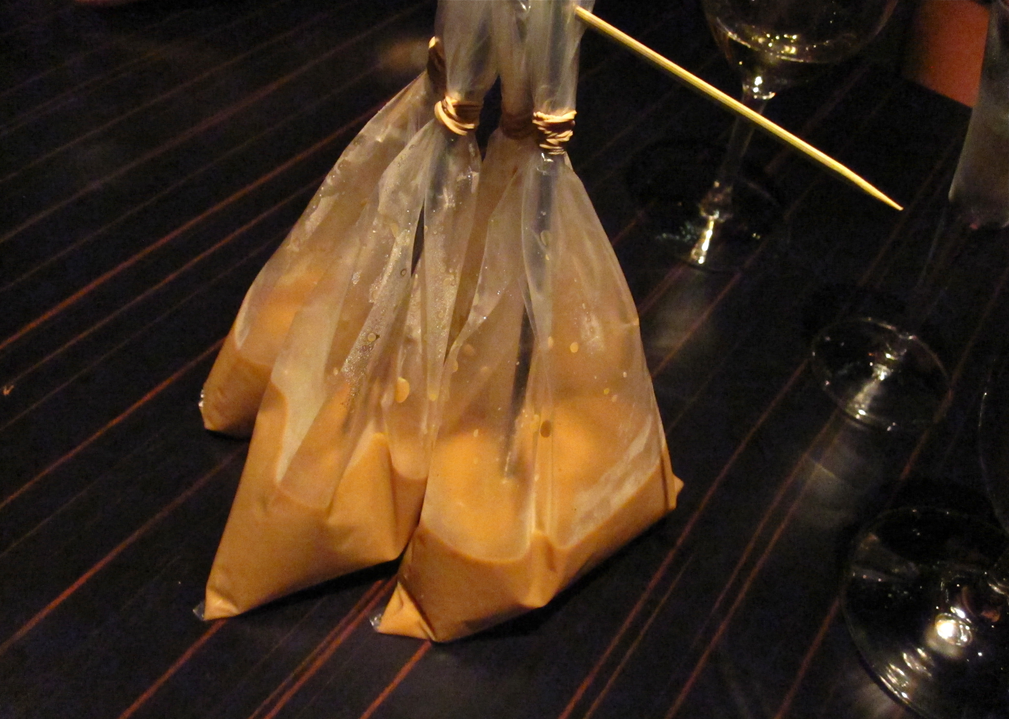 At this point I was craving dark chocolate (this is nothing new), but the final dessert, although sans chocolate, did the trick..a cool take on Thai iced coffee in a twisty-tie baggie brought to the table on a bamboo skewer.