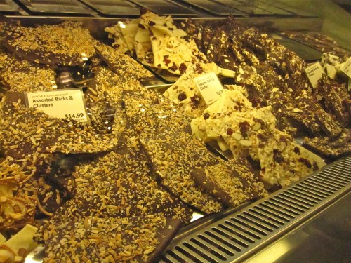 Are these new? Eh maybe not. Either way, I spotted an entire luscious bakery case at Whole Foods devoted to a mess of assorted chocolate bark studded with chopped nuts, dried fruit etc. Love the texture, crunch and flavor, and versatility of sweet bark, which I predict is the new cupcake/doughnut/pie…you heard it here first.