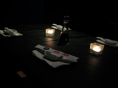 Bottle soy sauce, two votives, four place settings with wooden chopsticks, plates, soy sauce bowls, knapkins