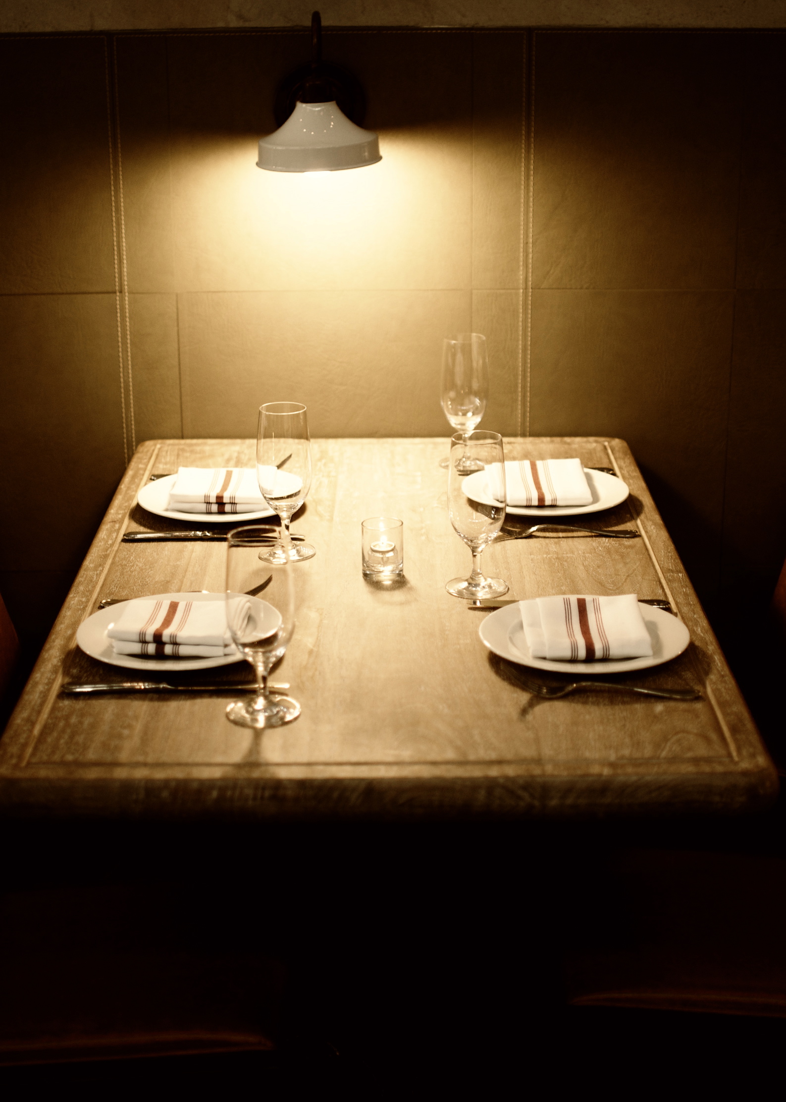 2 wine glasses, 2 water glasses, napkins, 2 knives, 2 forks. Bistro Campagne, 4518 N. Lincoln Avenue.