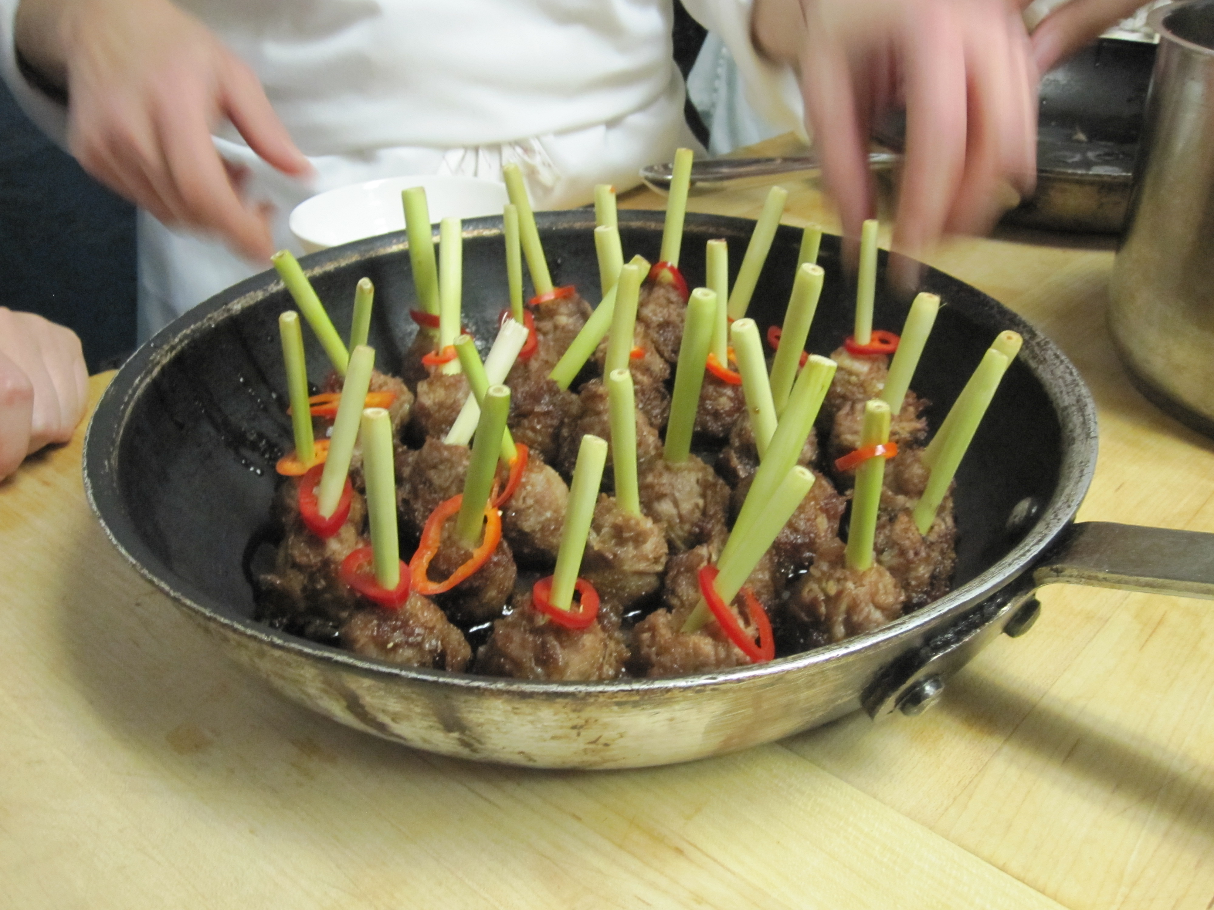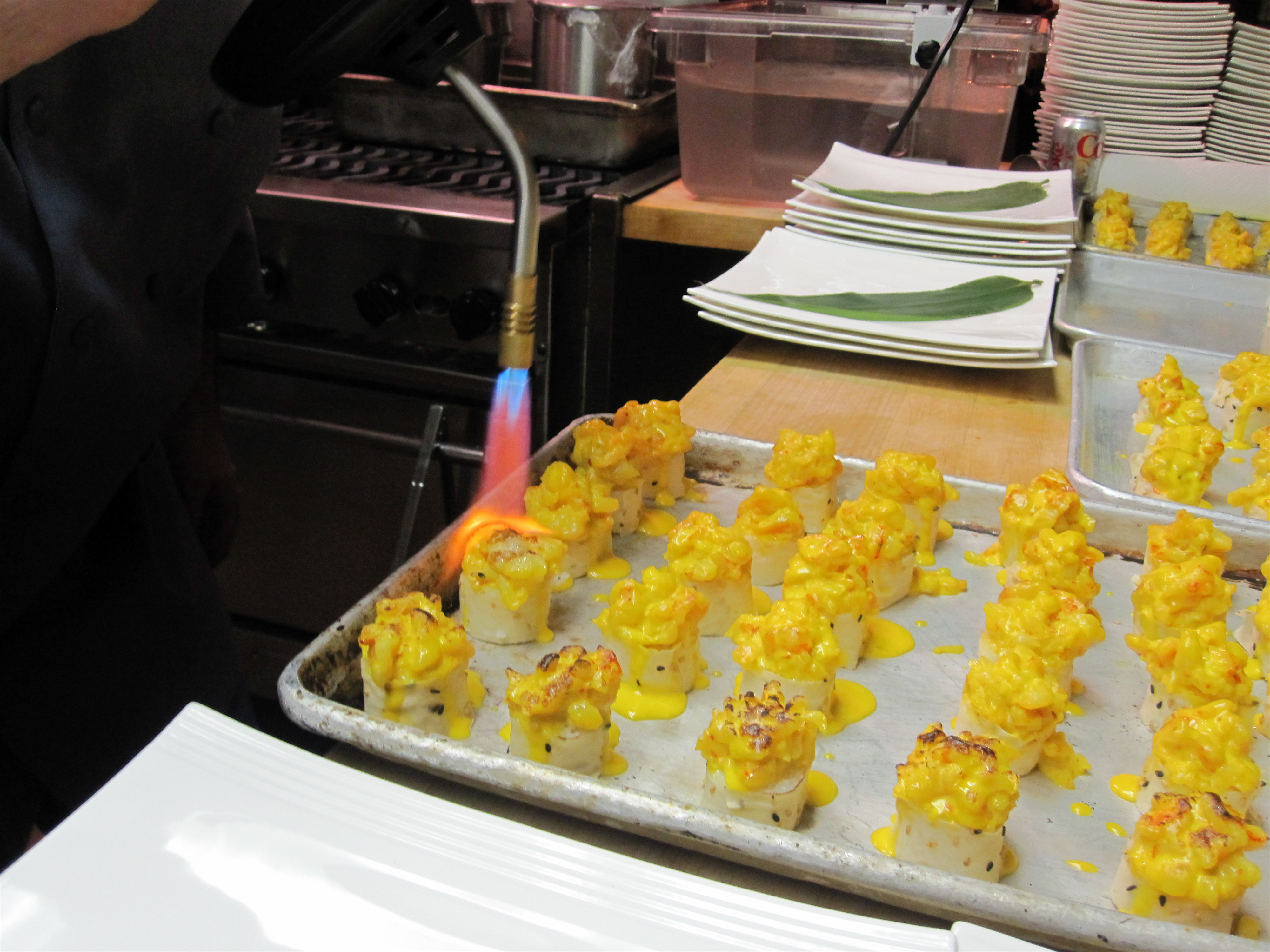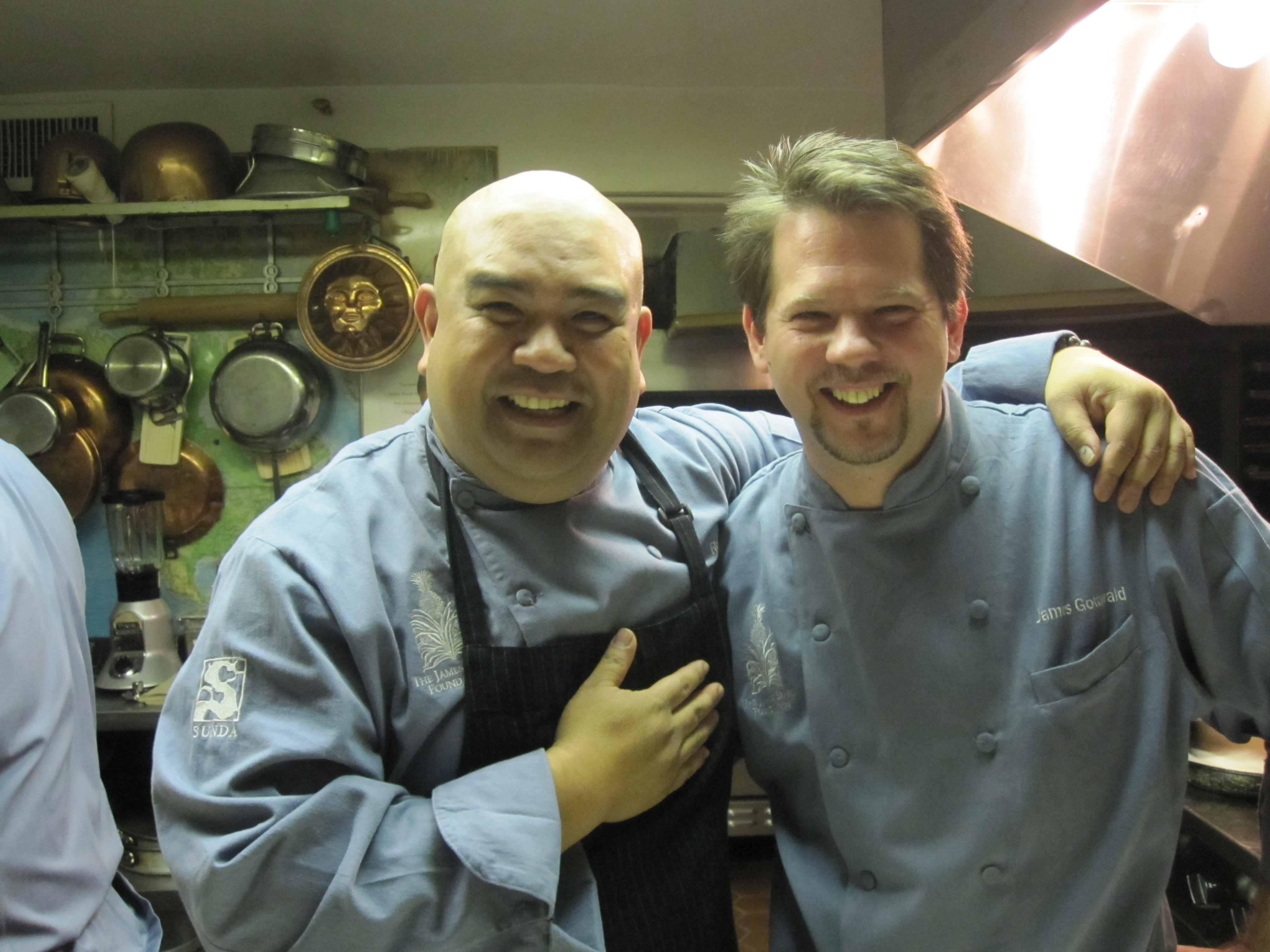 It was sort of weird, yet incredibly awesome, standing in the James Beard House in NYC on Nov. 6, an hour before the “Along the Silk Road” dinner with Sunda chef Rodelio Aglibot and Rockit chef James Gottwald was about to begin. The two Chicago chefs were huddling with their staff in the tiny semi-open kitchen, well, open in that you need to walk through the thing to get from the lobby area to reception/dining area in the surprisingly low-key culinary temple that resides in a legendary brownstone. The staff (French Culinary Institute students) was prepping for the night, torching poached shrimp in egg sauce, skewering beef with lemon grass for juicy meat lollipops, getting the sushi course ready, and generally preparing to roll out a Sunda-inspired feast to the night’s guests. It wasn’t Aglibot’s first time at the house, he talked about his mom crying hysterically at a previous dinner, where he was also introduced by Jacques Pépin. But I think everyone wanted to collectively cry at the night’s heavenly first bite of roasted duck hash on a daikon cake with unagi-glazed crispy duck skin and egg yolk tartare. A part of me was hoping for an adaptation of Sunda’s famous love-it-or-hate it watermelon unagi maki (I love, obv), but the hash served as a perfectly unctuous start with the similar flavor of sweet unagi. Next up was also worthy of a few tears of happiness; pork belly with big eye tuna served with mango, garlic vinaigrette and sweet chili sauce. It reminded me of the ahi tuna, mango and pork appetizer I love at Sunda, but this was a deliciously deconstructed version. Next came the sushi. A generous array of great white nigiri with shaved truffle, the earth and ocean roll; lobster maki, wagyu beef tartare and truffled foie aïoli, and a miso-marinated black cod with pickled ginger. There wasn’t a bamboo school of fish swimming along the ceiling, but we enjoyed the Sunda-approved sushi rolls all the same. An avocado mousse palate cleanser with frozen lychee and berries got us ready for Midwest honey and ginger braised beef long ribs with with lobster scented arroz caldo. Tender, sweet and fragrant, it represented Aglibot’s mastery with a hunk of meat, and perfectly matched a Domaine Chandon Pinot Noir ’07 from Russian River Valley. And dessert..camparado; a Filipino chocolate rice pudding with preserved young coconut, toasted rice flakes and crispy strips of lap cheong, yes, sweet and spicy pork. In rice pudding. Not a taste for everyone, but I loved it and am still purposing a permanent move onto the Sunda menu. The Boo-dah’s night cap cocktail with Hennessey Black and marmalade was the perfect ending to a night represented by two of Chicago’s finest. I wanted more of my food photos to turn out, I really did, but the dimly lit room just wasn’t conducive. So I apologize, but a few to enjoy from a night to remember.